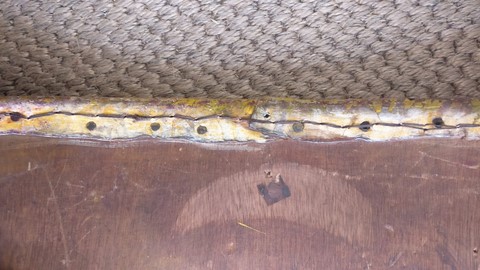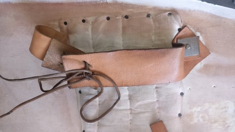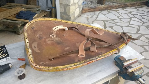 - Il faut de la colle à bois à prise progressive, du cuir tanné végétal pas trop épais (2/3mm) ou du lin fort, des clous de tapissier, des sangles à cliquet (idéal), des serre-joints, 2 planches de contreplaqué de 5mm ou 3 planches si besoin (attention au poids).