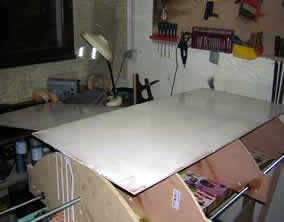 Il s'agit d'enduire de colle les planches de contreplaqué. Utiliser par préférence une palette de type "peigne" à grosses dents en croisant les passages pour étaler la colle.