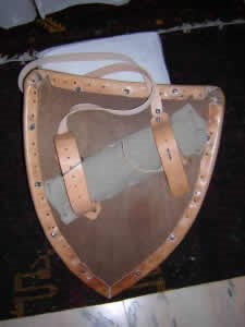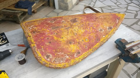 Rénovation d'un vieux bouclier, avec couture du bord et remplacement des énarmes. Les anciens trous de rivetage ont été bouchés avec des chevilles bois.