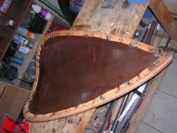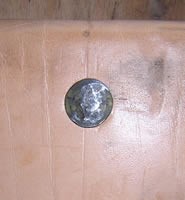 Alternative : Si le bord n'est pas rabattu il faudra le matérialiser par une bande de cuir d'environ 5 cm de large sera appliquée à cheval sur la tranche. Elle peut être soit clouée avec des clous de tapissier, soit cousue au point de sellier. Ci-contre les deux exemples de réalisations par clouage et par couture.