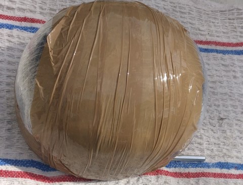J'ai utilisé un cuir de 4/5mm dit "tanné végétal" pour qu'il puisse être travaillé. J'ai tracé puis découpé un cercle calculé sur la base de la surface de la forme. Le cuir a ensuite été est mis à tremper 3 jours. Puis, je l'ai battu au maillet de bois afin de la rendre plus malléable.
