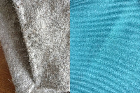Une laine (2/1 sergé), grise, non teinte, plus épaisse que celle de la cotte a été choisie pour la chape paysanne (figure 3, gauche). Une laine en suint aurait sans doute été une alternative intéressante à tester, mais une telle étoffe semble difficile à trouver…
