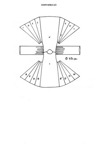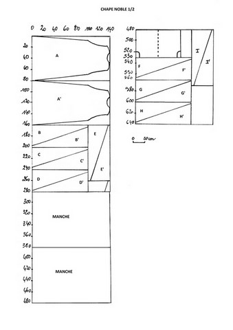 Les deux chapes expérimentées (patrons 1 et 2-2bis) ont une construction générale similaire, avec une partie couvrant le corps très proche de la forme du surcot. Les manches y sont figurées sous la forme d'un tube pour mieux distinguer leur emplacement final dans l'emmanchure.