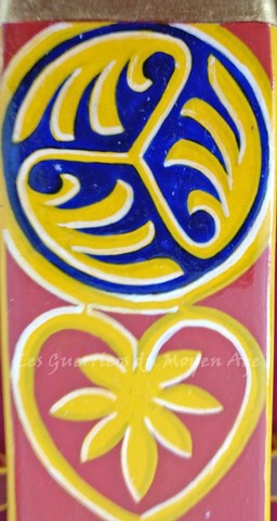 Nos amis des Milites de Dun ont bien voulu participer au projet : Frédéric Jonet s’est chargé de la menuiserie et Laurent Cathala a œuvré à la sculpture. Le siège, pliant, a été fabriqué en bois de hêtre. Il est en partie sculpté (extrémités supérieures et inférieures des pieds) et entièrement peint, selon la technique de la tempera. La base des têtes et le sommet des pieds sont délimités par de fines bandes réalisées à la feuille d’or.