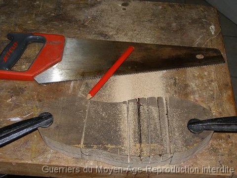 - Scie, cutter, crayon de bois, maillet, ciseau à bois, quelques punaises, du fil de lin poissé, une aiguille à bout rond pour le cuir, de l’huile de lin, un pinceau.